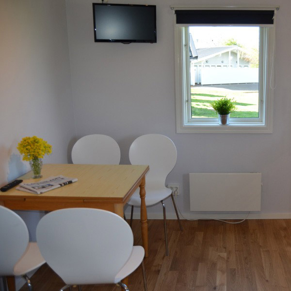 Dining area for 4 people and TV. Kitchen equipment for 4-6 people with cookware, crockery and cutlery.